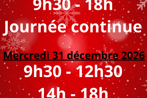 HORAIRES FÊTESNous vous rappelons nos horaires de fêtes : Mercredi 24 décembre : ouvert en journée continue de 9h30 à 18h […]