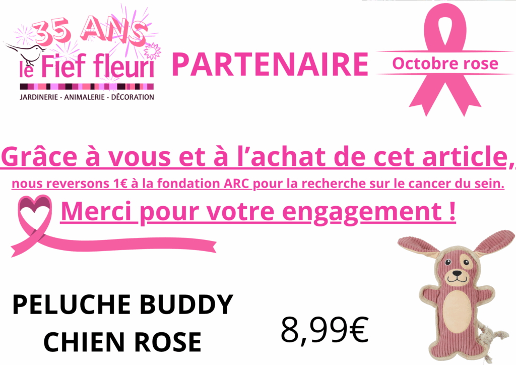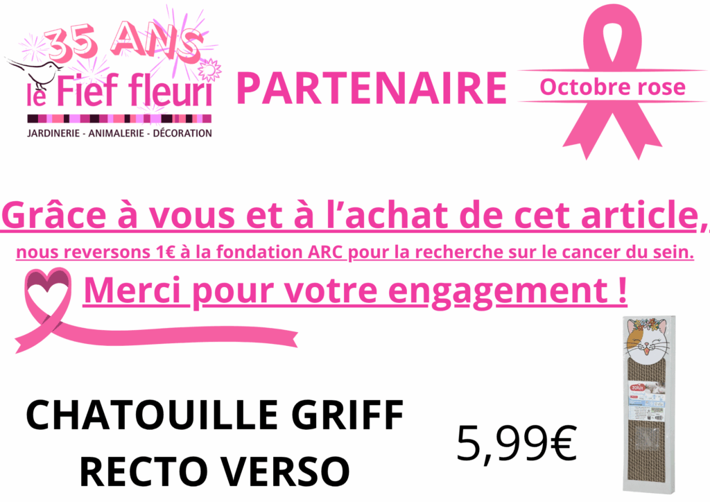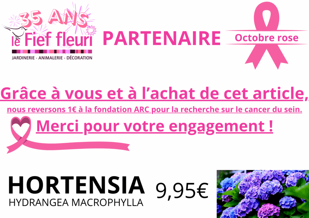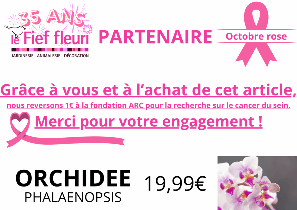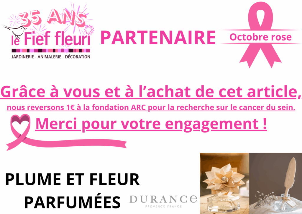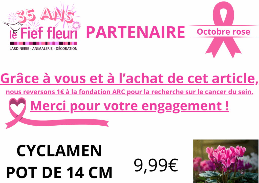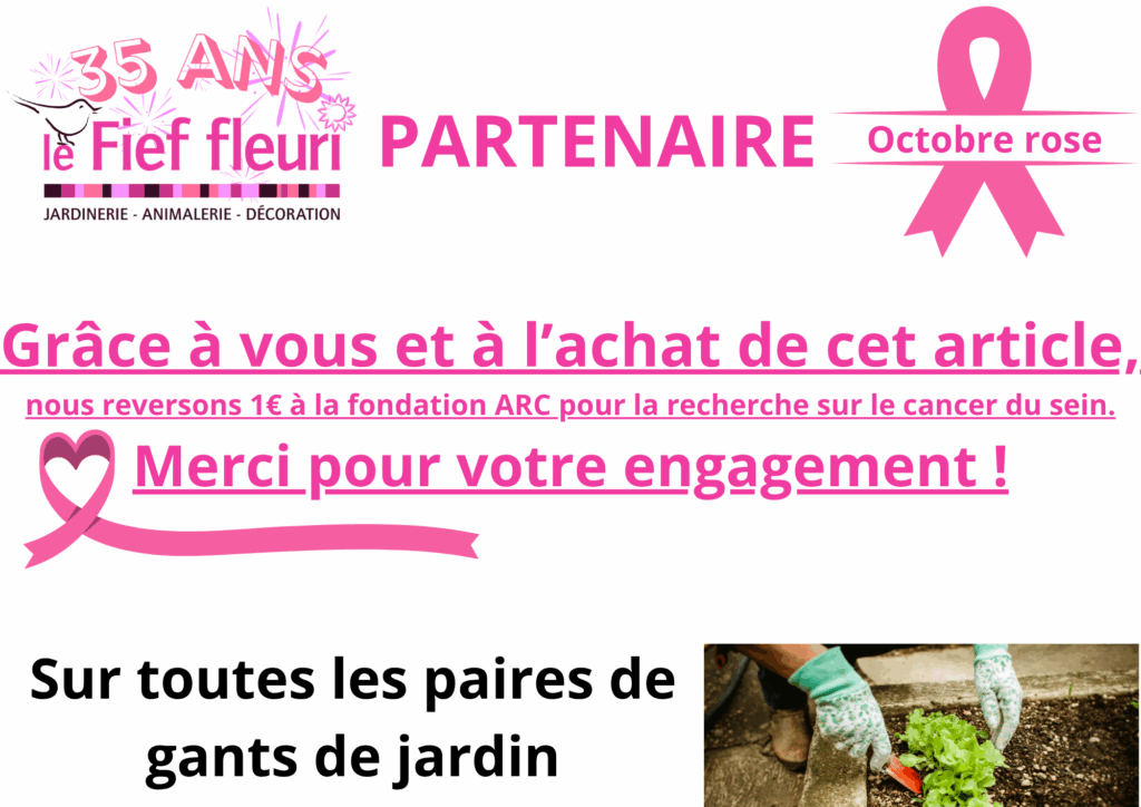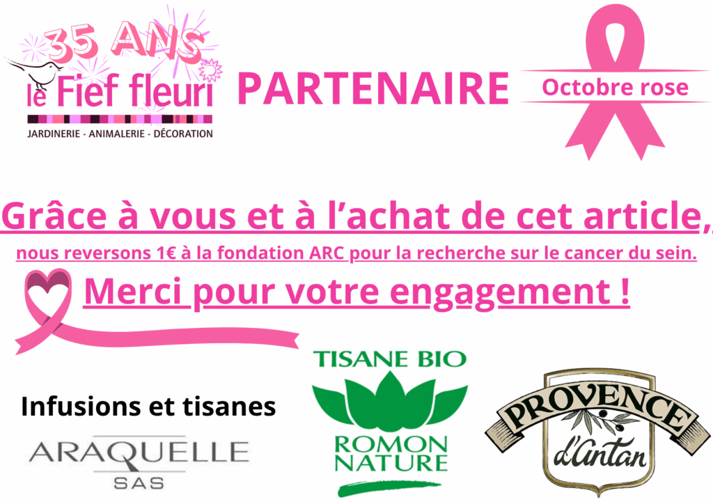 Grâce à vous et à votre achat, sur une sélection d’articles dans plusieurs secteurs de la jardinerie, nous reversons 1€, pour chaque achat, à la fondation ARC pour la recherche sur le cancer du sein.