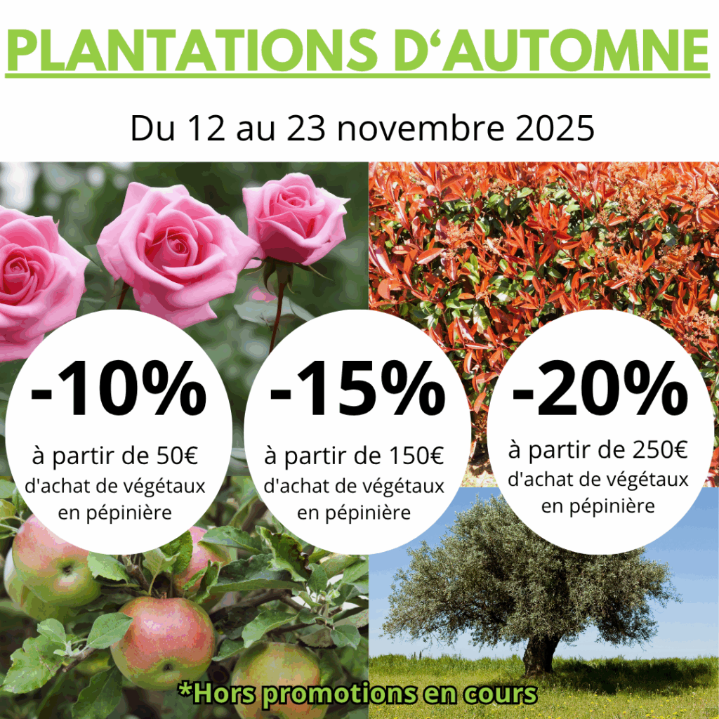 Cette année, il a fait très chaud mais il a aussi beaucoup plu. C’est le bon moment de planter ! Que ce soit les plantes de haie, les fruitiers, les agrumes, les plantes méditerranéennes ou les rosiers : Profitez des remises sur un choix exceptionnel en pépinière.